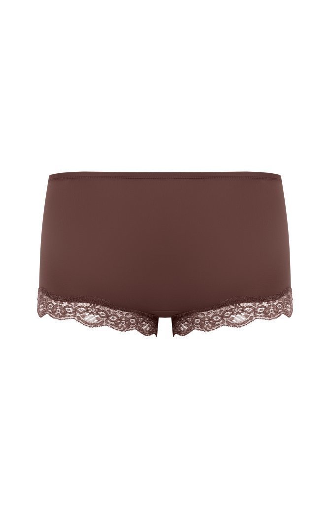Incredibly soft mid-rise shorts, adorned with delicate stretch lace trim along the leg openings. They provide full coverage at the back and feature a 100% cotton gusset for comfortable wear.